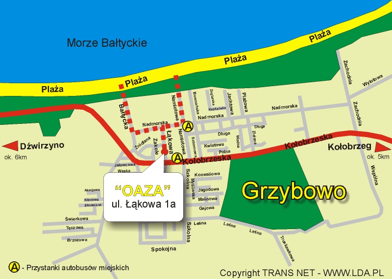 - Dojazd z Kołobrzegu autobusem linni miejskiej nr. 6 (przystanek docelowy przy ul. Szkolnej w Grzybowie)